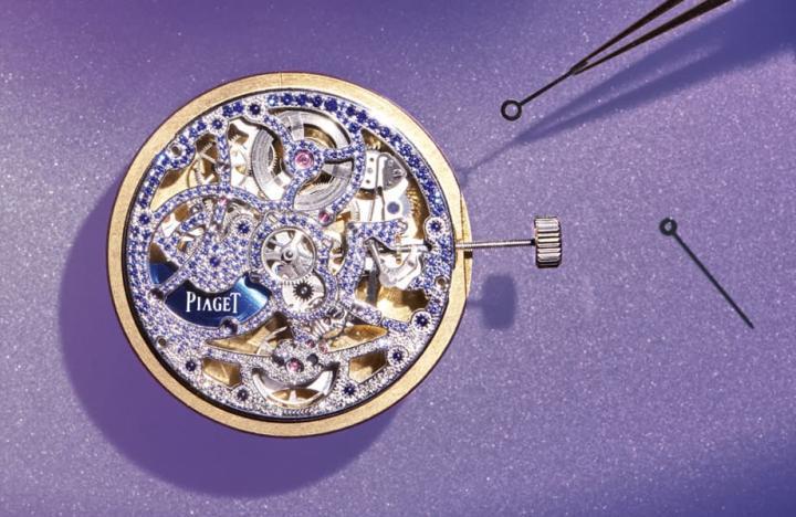 一般来说超薄手表要把机芯镂空已经具有不小难度,因为在零件本身已经相对薄的情况下还要将零件镂穿,这可能会影响到机芯结构的强度与稳定性,然而伯爵研发超薄表已有相当丰富的经验与技术,因此品牌得以在兼顾机芯稳定结构之余,再将镂空工艺带入手表,呈现更为通透的视觉效果。不只如此,Altiplano Skeleton高级珠宝表还在镂空后的机芯桥板上镶嵌宝石,钻石和蓝色蓝宝石不仅镶饰于主夹板上,也出现在机芯中那些超级纤薄的零件上,例如厚度仅0.69mm的弹簧盖等,就连固定零件的螺丝也在伯爵的巧思下被包镶覆蓋在11颗凸圆形切割蓝宝石下,让手表正面显得华丽非凡。