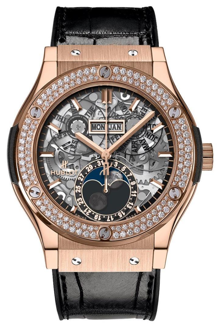 皇金材质/HUB1131自动上炼机芯/时、分、秒、日期、星期、月份显示/月相显示/表圈镶钻138颗,约重1克拉/蓝宝石水晶镜面/防水50米/表径45mm