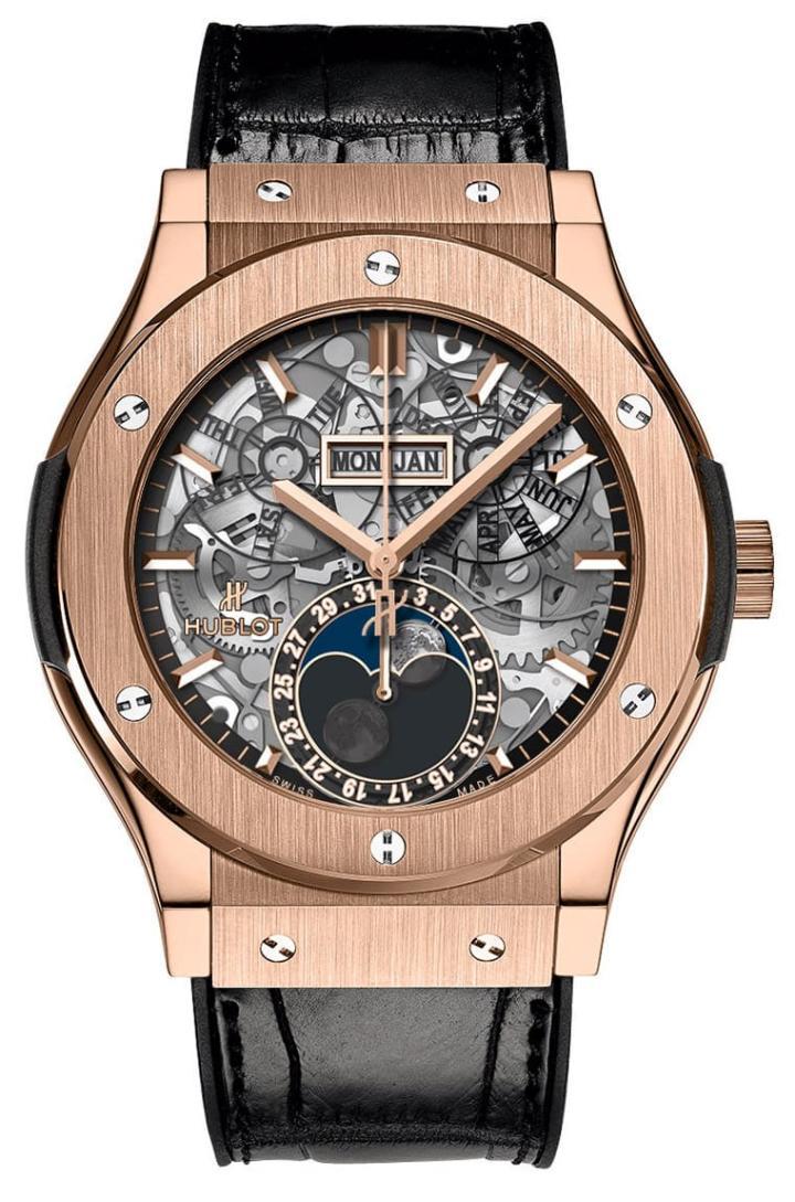 皇金材质/HUB1131自动上炼机芯/时、分、秒、日期、星期、月份显示/月相显示/蓝宝石水晶镜面/防水50米/表径42mm