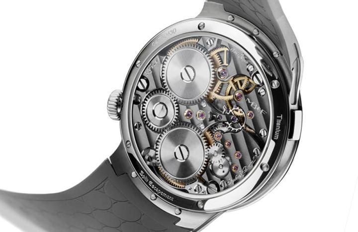 Split Escapement机制是由北爱尔兰制表大师Stephen McDonnell协助MB&F创作完成,这种机制秉承品牌经典悬浮平衡摆轮的结构,不过为了解决先前推出的万年历手表面盘没有空间可以同时容纳摆轮及擒纵系统的问题,因此Stephen McDonnell想到独特的创意:他设计出前所未见、目前表坛最长的平衡轴,跨越整枚机芯后先将摆轮独立设于面盘,同时将擒纵系统的锚形擒纵轮翻转设于机芯背面,所以才会把此机制命名为“分离式擒纵系统”。