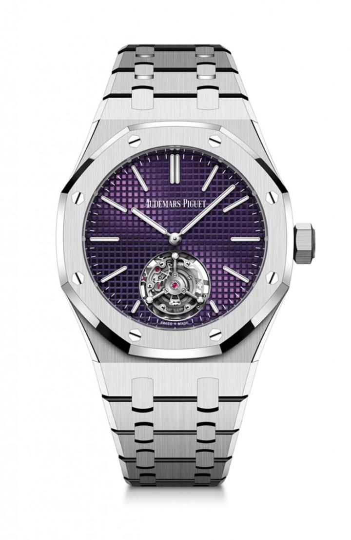 新款RD#3不只是表径与表壳作工和上一款有个别差异,包括面盘颜色也出现变化,这次爱彼使用墨紫色点缀手表的Petite Tapisserie小型格纹,这种颜色可说是RO家族里面的“特殊色”,品牌于制作过程中采用CVD(化学气相沉积)涂层技术制作,优点在于保持色彩亮度不坠之余,还可以长久维持不容易褪色。墨紫色面盘上可见白色爱彼标志与轨道式分钟刻度直接印在格纹上,同样的白色调也呈现在指针与时标表面的夜光涂层上,由紫色烘托白色,利用色彩对比度来提升视读清晰性。手表的功能核心——飞行陀飞轮就位在6点方向,少了顶层桥板使得陀飞轮的运转动态可以看得仔细,品牌采用钛金属制作陀飞轮框架,有利于优化动能传输效果,间接提升手表走时精准度。