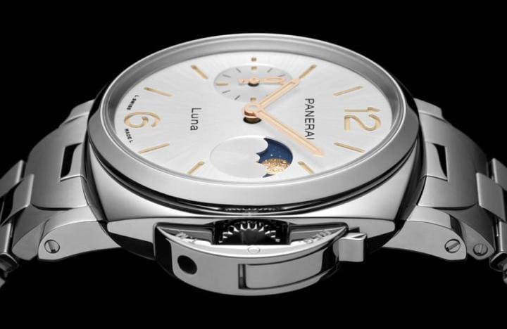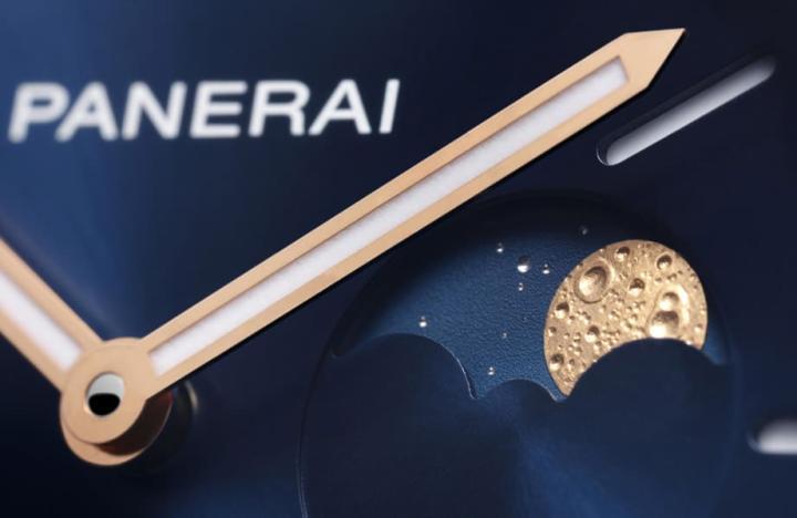 表款的三个不锈钢版本面盘都采太阳放射纹修饰并以三明治结构强化夜光效果,其中蓝面的Super-Luminova™夜光涂料为白色、白面的夜光涂料则是米色,利用颜色的对比提升手表平时的阅读清晰度。至于Goldtech™红金材质版本改以立体镶嵌时标的形式,达到与不锈钢款同中求异的效果。而不论不锈钢或红金表壳,它们的月相显示虽然走传统风格,但是沛纳海特地以24K金雕琢成的圆月图案搭配渐层蓝色并附有大小星星般圆点装饰的月相盘呈现,佩戴者在观赏月相变化时,更能深刻感受到天体如临眼前的拟真感。