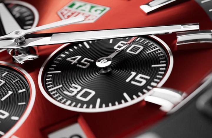 为了让三种颜色面盘款式各有各的风格,泰格豪雅特别在面盘细节上做出变化,例如绿面款的小表盘带有红色外框、中央计时秒针为白色、黄面款的小表盘边框为黑色、中央计时秒针为红色,至于红面款的小表盘边框又变成了白色,搭配白色中央计时秒针,这些细节看似不起眼,却有助于不同面盘颜色款式建立专属个性。