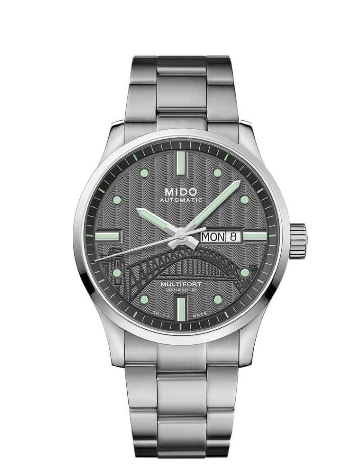 此次美度表精心替这款表设计的亮点出现于面盘,当然这只表同样具备垂直日内瓦波纹,一般来说这种装饰纹路比较常见于机芯底板,但是美度表勇于走出自己路,使得机芯装饰工艺也能成为面盘上塑造鲜明印象的重心。有鉴于手表的特别版身份,品牌特别在面盘下半部镌刻上雪梨港湾大桥图案,图案经Super-LumiNova®黑色夜光涂层处理,因此佩戴者若处于黑暗之中,面盘上雪梨港湾大桥的建筑线条会以绿色夜光清晰呈现轮廓。