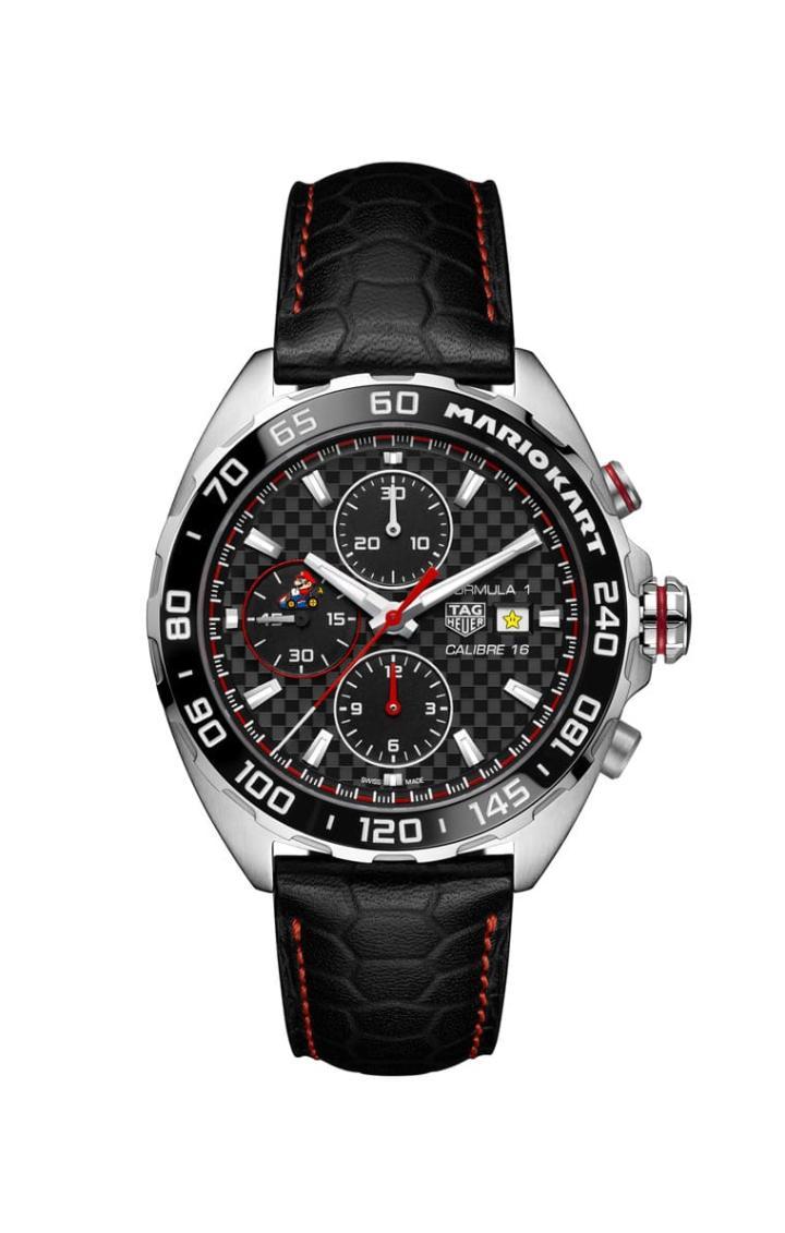 TAG HEUER X Mario Kart玛利欧赛车联名限量计时码表的面盘采用黑灰色相间的赛车棋盘格图案,左三眼计时表盘的黑色近看会发现其表面带有粒纹效果,隐隐有赛车跑道沥青材质的况味,呼应手表的赛车主题。另外红色细节也出现在小秒盘外圈、中央计时秒针、6点方向计时时针与面盘外缘的刻度环上,同时9点方向的小秒盘更直接放上一枚玛利欧驾驶著赛车的图案,而与玛利欧赛车图案对应的是3点方向的日期窗,泰格豪雅巧妙以星星、砲弹刺客、香蕉、蘑菇等电玩中会出现的道具元素取代部分日期数字,让玛利欧迷们看到倍感惊喜。表款实底盖刻有玛利欧赛车图案剪影,内部则是搭载Calibre 16机芯,而从底盖上缘刻印的”LIMITED EDITION”字样则点出手表限量3000只的收藏意义。
