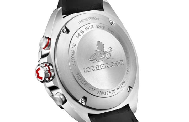 TAG HEUER X Mario Kart玛利欧赛车联名限量陀飞轮计时码表表背改用透明底盖,其上印有”Mario Kart”字样,镜面下方则露出Heuer 02T自动机芯,泰格豪雅精心于自动盘刻上玛利欧、路易吉和黛西公主驾驶赛车的剪影,而机芯基板与夹板都镀上黑色,衬托出红色导柱轮机制的存在。底盖上缘进一步刻上手表的限量编号,陀飞轮计时码表的限量数比计时码表少很多,仅发行250只,而且以上这两款玛利欧赛车联名表都只会在品牌专卖店发售,相关发售资讯不妨参考泰格豪雅的官网与社群软件。