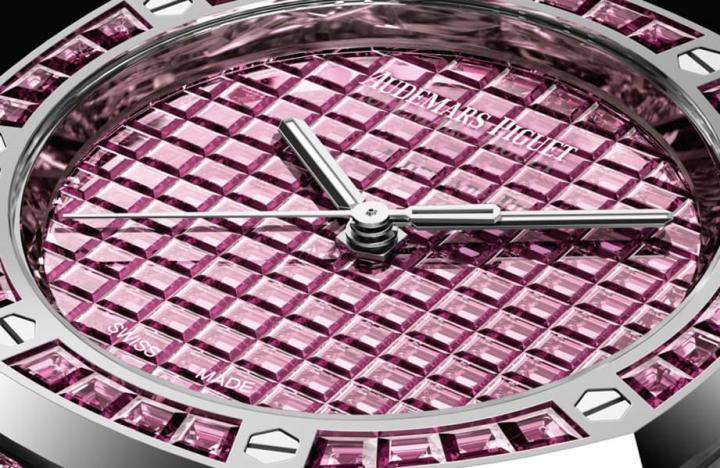 针对这两组彩虹宝石皇家橡树自动表,爱彼和SalaNitro SA决定以隐形镶嵌工艺来突显宝石的色泽魅力,工艺师进行隐形镶法时,会在每颗宝石底面切割出一条小沟槽,然后借由宝石的沟槽与贵金属底座进行嵌合固定,过程中要先确保前一颗宝石已经彻底固定完成后,才能接续下一颗宝石的镶嵌,如此一来宝石表面看起来好像没有任何固定镶爪,仅靠每颗宝石紧密排列就固定在一起,其实宝石并不是紧紧相连就能固定,而是在底部暗藏玄机,并使宝石的光芒可以尽情释放呈现在观者眼前。