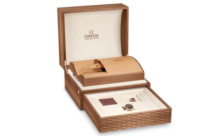 超霸Chrono Chime有个彩蛋就是欧米茄帮手表专程打造一个表盒,表盒本身以胡桃木制成并分为上下两层下层除了收纳手表外,还有放大镜、随行袋等配件,至于上层掀开会看到一个特殊设计,其以云杉木制成,手表可以穿过其中的手把部分,形成三问功能的共振板,也就是当表主把手表取下想要鉴赏三问乐音时,可以直接把手表放在表盒的共振板上,如此可以更清楚放大问表的报时乐音。