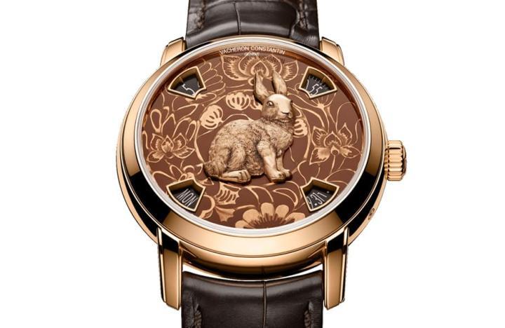 江诗丹顿兔年生肖表以手工雕刻枝叶装饰图案,图案源自中国传统花卉图纹,并采用半嵌入式设计,将深浅不同的浮雕图案组合在一起,形成层次感丰富的背景效果。接着江诗丹顿再采用大明火珐瑯工艺为面盘增风添彩,工艺师会在面盘涂上数层珐瑯釉彩,接着于摄氏800到900度的高温中窑烧,过程中还要紧盯釉料颜色的变化和烧制有没有出现问题。在两款兔年生肖表中,玫瑰金版本采用的是棕色珐瑯面盘、铂金版本则是施以蓝色珐瑯面盘。