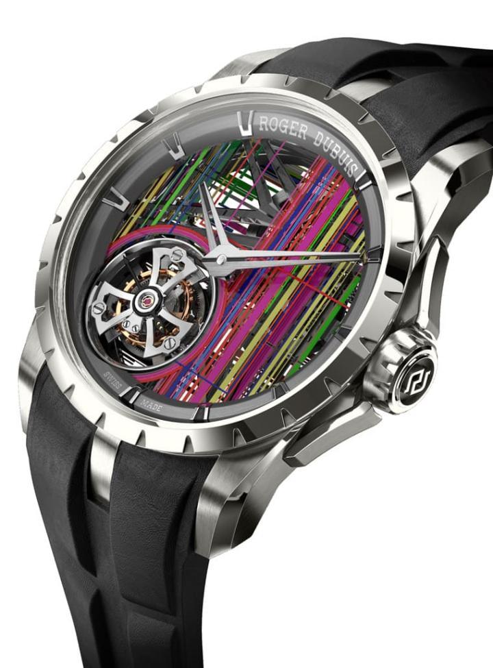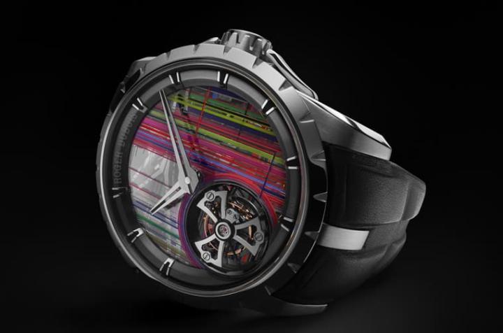 为了将刘韡画作特色搬上手表舞台,罗杰杜彼简单透过三层结构来容纳精密机械结构与艺术家的灵性笔触。首先第一层便是面盘的蓝宝石水晶,品牌在面盘正反面都刻上纵横交错的线条,接着还要用各式各样的彩色颜料替这些粗细不一的线条上色,别看手表七彩缤纷美不胜收,实际上制作过程没有想像中容易,为了要避免颜色与颜色间混合,在替面盘正反面上色时,都需要等前一道线条颜料干燥后才能进行下一道线条的彩绘工作。