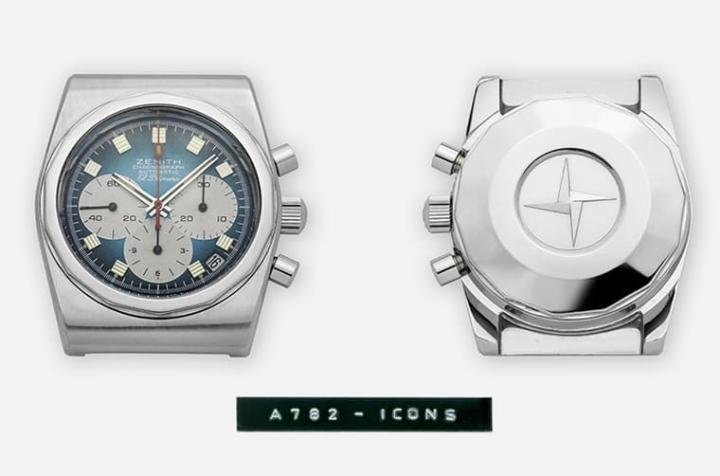A782完全采用1970年代太空时代风格设计,品牌当时首次将El Primero高震频自动计时机芯以悬空方式搭载于坚固的DEFY表壳之中。蓝色渐变面盘饰以条纹镶贴时标,并以镜面抛光表壳外缘,独特的酒桶形不锈钢表壳与十四边形表圈和旋入式表冠相得益彰。这款表当年仅限量1000只,现在能有机会拥有更显珍贵。