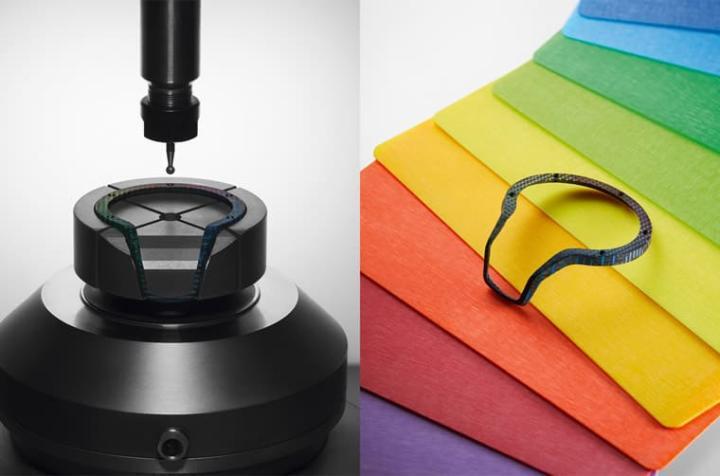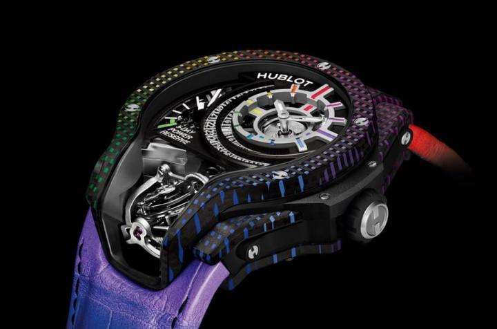 MP-09自从2017年首度问世后,宇舶历年来也尝试采用过多种材质制作,包括钛金属、碳纤维与蓝宝石等等,然而这次新款的碳纤维表壳再度超越了极限,以前所未见的七彩缤纷造型现身,制作过程虽与镶嵌彩色宝石的做法不同,但同样都能替手表带来多彩绚烂的外型,不过也因此让人更加好奇品牌到底是运用了什么魔法,将传统都是黑色为主的碳纤维材质变化成亮眼的彩虹配色。