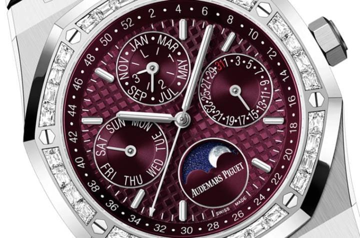 新款皇家橡树万年历的Grande Tapisserie大型格纹面盘也跳脱目前的配色框架,启用紫红色调突显手表的华丽个性,搭配白金时标和指针对比强烈且易读性也高。而手表面盘展示的功能同样一目了然,包括3点方向的日期显示、9点方向的星期显示、12点方向的月份/闰年显示,加上6点方向的月相显示等,同时面盘外缘的刻度搭配中央指针则能指示一年内的周数,这是AP这款万年历的一大特色,同时手表的各项显示也可借由表壳两侧的隐藏式按把各别调校。