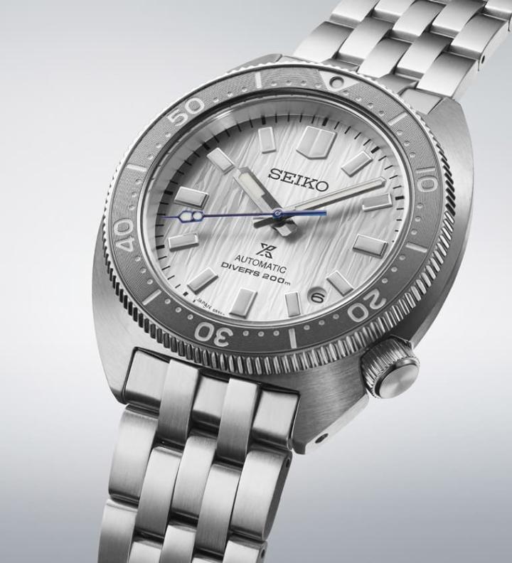 这款Prospex制表110周年纪念表是以SEIKO 1968年制作的6105-8000潜水表为创作蓝本,包括鲍鱼壳造型以及将表冠设置于4点方向的设计都是来自当年那款古董表,新款采用不锈钢材质打造,表圈则以同心圆饰纹强化视觉效果与手表的整体质感。