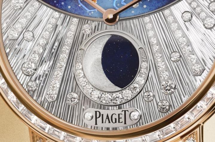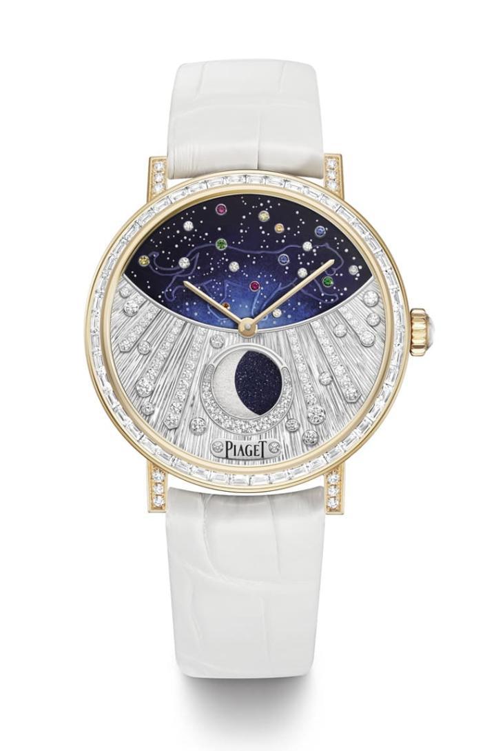 Altiplano系列月相显示珠宝表分别以白金或玫瑰金制作36mm的表壳,品牌先在表圈、表耳等处镶上数十颗美钻,并分别替手表配置红色、深蓝色与白色的鳄鱼皮表带,营造出手表的高雅质感,至于面盘更是精华所在。