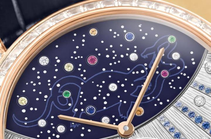 伯爵耗时两年研发出Altiplano系列月相显示珠宝表的面盘,并邀请到瑞士珐瑯大师Anita Porchet操刀绘制半透明蓝色珐瑯天空,面盘上半部别以珐瑯圆点和珍贵宝石勾勒出中国古代星宿。此系列四款作品均拥有一颗守护星,它们都分别代表着一个基本方位,并与四个季节及四大元素的其中之一相结合,例如青龙代表东方,也象征著春季和林木;朱雀隶属南方,且接近夏季和火焰;白虎望向西方,是秋季与金属的良友;而玄武盘踞北 方,在冬季与水域之中安然自处。
