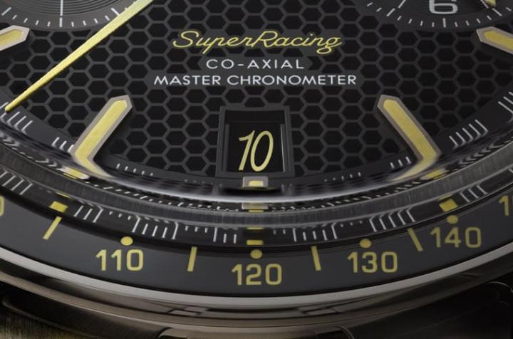超霸Super Racing计时码表采用不锈钢材质,搭配黑色陶瓷表圈,面盘外围也有传统超霸经典的赛车风格分钟刻度,手表一如海马Aqua Terra >15,000 Gauss,黄色是主要的装饰细节,因此包括表圈上的测速计刻度、中央渐层计时大秒针、3点方向小表盘指针、日期盘数字、”Speedmaster”与”SuperRacing”字样等都是黄色,包括时标与时、分指针表面Super-LumiNova超萤光涂料也是黄色,在黑色背景衬托下显得格外显眼。