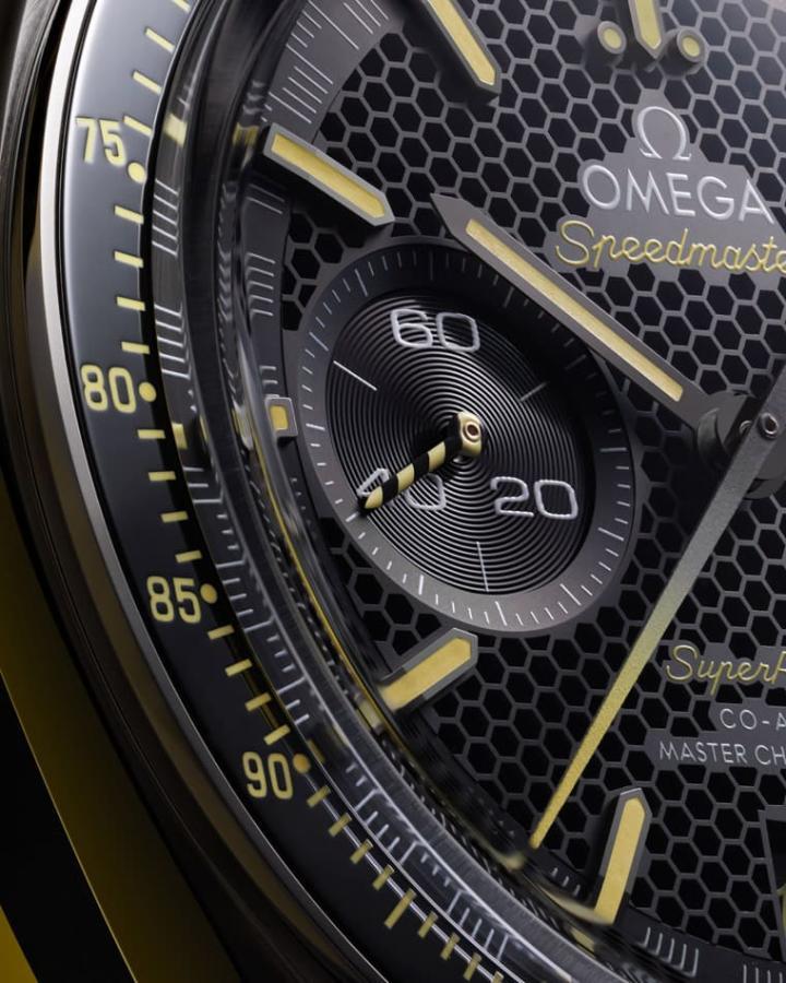 表款的面盘拥有不同于海马Aqua Terra >15,000 Gauss的蜂巢图案,据说这个设计的灵感来自欧米茄博物馆展示的一款抗磁性能>160,000高斯的概念表,比起一般超霸Racing计时码表的黑色面盘多了细腻的视觉层次。此外欧米茄也在日期显示部分留了一点惊喜,原来日期盘的字体特别在”10”这个数字变更为与”Speedmaster”字样相同的草写风格(其他日期的数字则是与一般超霸计时码表无异),这样的巧思正是为了呼应欧米茄>15,000高斯抗磁手表诞生十周年的里程碑而设,因此每月十日佩戴者便可以好好享受这个意义深远的赏表逸趣。