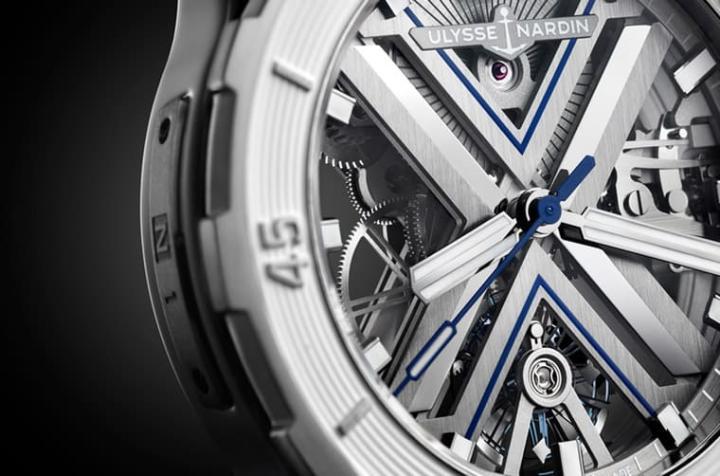 镂空面盘露出大大的”X”造型,呈现出属于雅典表浓浓的品牌基因。