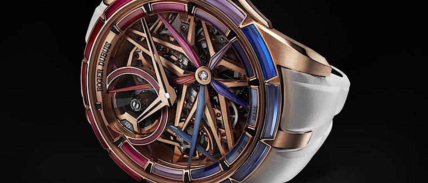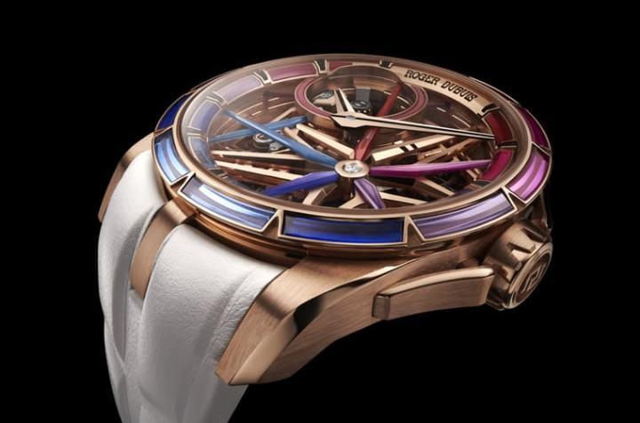 表款本身的外观、功能与机芯都与其他王者系列单摆轮手表相同,不过这次品牌特别在表圈与面盘镶上渐层彩色的尖晶石,色彩呈现从红色到蓝色的过渡性,而且罗杰杜彼还在尖晶石部分加上Super-LumiNova夜光涂层,如此一来表款无论在白天、黑夜或紫外光下,表圈与面盘上的尖晶石都会尽情释放彩色的效果。这些渐层色彩的尖晶石随着镶嵌部位不同,它们的形状也有相应变化,例如表圈与面盘外圈的尖晶石主要是矩形、微型自动盘外围的尖晶石则是弧形,至于面盘独具品牌辨识度的星形桥板上,其尖晶石则又呈现出细长的几何造型,凡此都让手表不只颜色丰富,也表现出立体的纵深效果,彰显其镂空设计的独特之处。