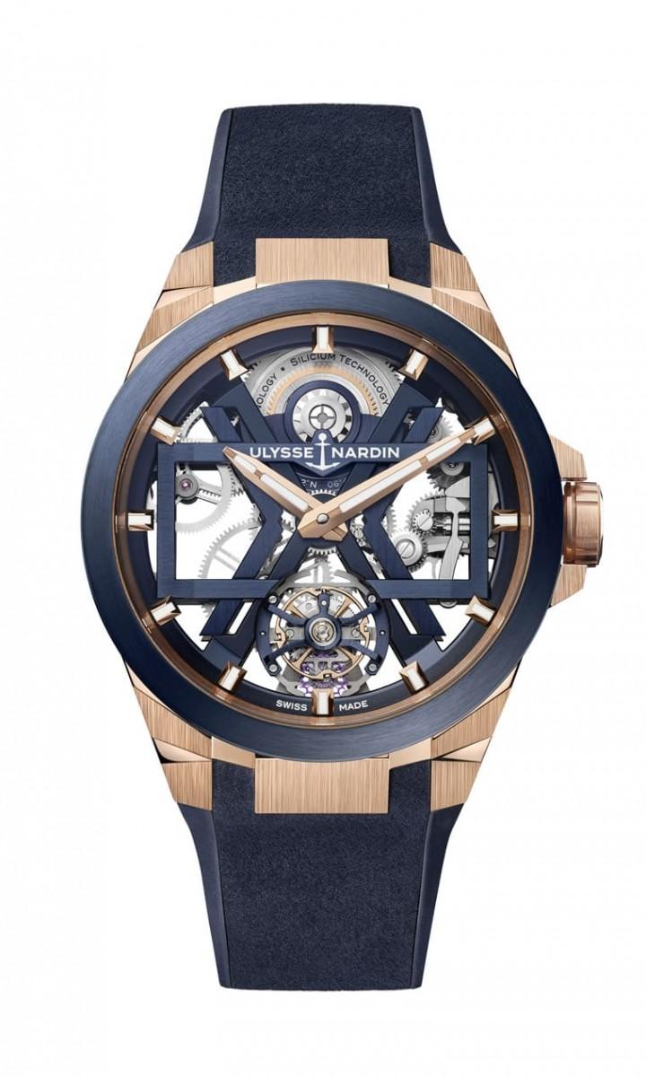 ULYSSE NARDIN雅典表首度将玫瑰金材质与富有品牌辨识度的蓝色结合,并呈现于Blast镂空陀飞轮上,如此运动感与华丽感和谐共存的巧妙,加上手表本身具备陀飞轮等级的复杂度,于工艺层面和视觉层面而言,Blast镂空陀飞轮都是一款展现品牌制表造诣的代表作。
