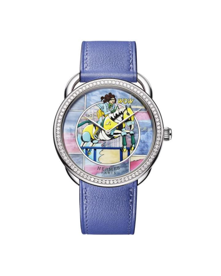Arceau Wow微绘工艺手表于面盘大胆引进美式漫画风格图案,面盘上拥有漫画别树一帜的分格画面,正中央的圆形框框中跃然而出一位骑乘机械马的超级女英雄式人物,她并非我们所熟知的某一位漫画人物,而是品牌口中的“爱马仕女士”。除了面盘的图案很吸睛又缤纷,Arceau Wow微绘工艺手表的面盘制作方式也是手表一项引人注目的亮点。