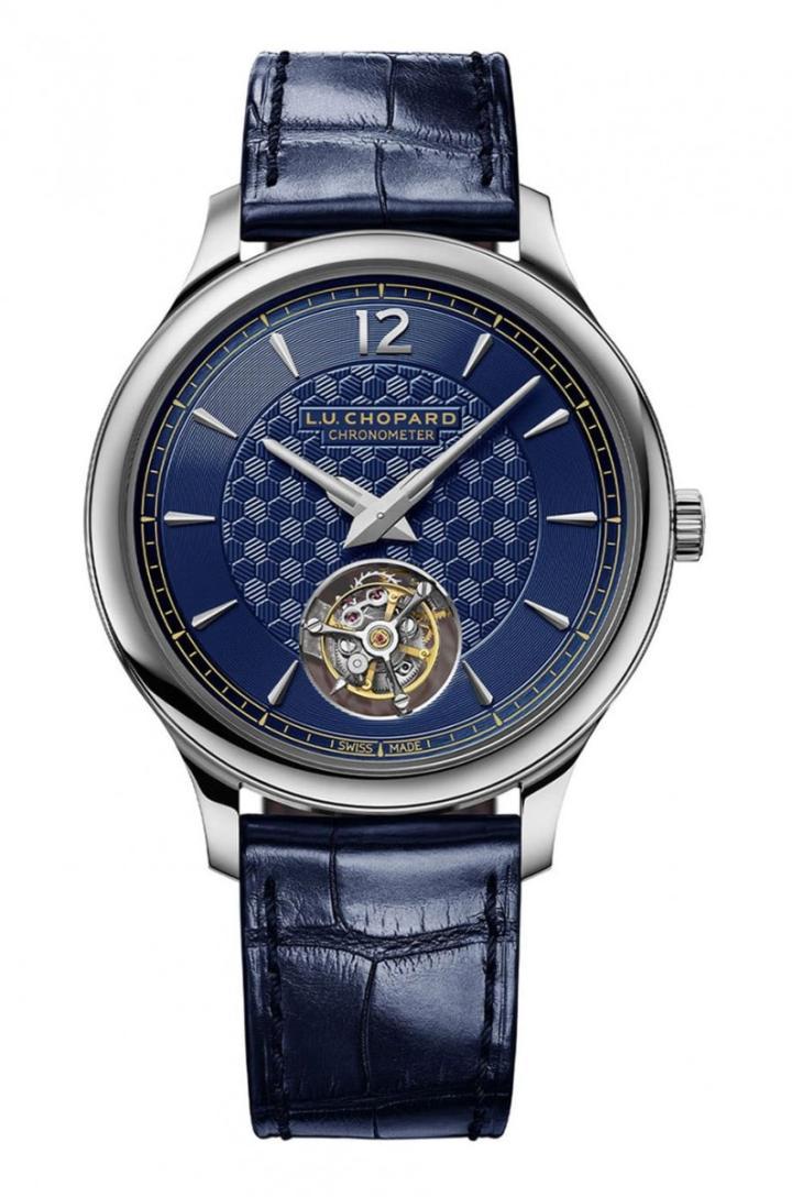 表款采用符合伦理道德标准的贵金属制成,其延续L.U.C系列的纤薄特色,整只表的厚度仅7.2mm,佩戴在手上相对轻盈舒适,萧邦替手表搭配深蓝色鳄鱼皮表带,一方面可以呼应面盘色调,同时也展现男士的雅致型格。面盘以电镀方式镀上蓝色,面盘中央则有手工扭索饰纹点缀蜂窝图案,熟识品牌历史的人对于这个图案应该特别有感,因为萧邦创办人Louis-Ulysse Chopard最初就是用蜂窝图案做为产品的识别特征,因此在面盘中央点缀数量可观的蜂窝图案,其中也蕴含向品牌历史致敬的用意。萧邦于L.U.C XPS Tourbillon Volant的蓝色面盘外围加上黄色分、秒刻度具有画龙点睛的效果,一般而言蓝色给人稳重的感觉,但是黄色则呈现截然相对的活力感,品牌于此悄悄地用黄色妆点面盘,一方面能突显刻度的存在感,同时也可以体现出男性内心的活泼个性,犹如面盘6点方向的陀飞轮般自转不息,永远散发旺盛活力。表款搭载的是L.U.C 96.24-L机芯,其采用萧邦独家Twin技术, 以双发条盒输出65小时动能,且机芯也带有停秒功能,以达到精准对时的目的,这枚机芯通过日内瓦印记与瑞士天文台双认证,展现品牌不同凡响的制表水准。