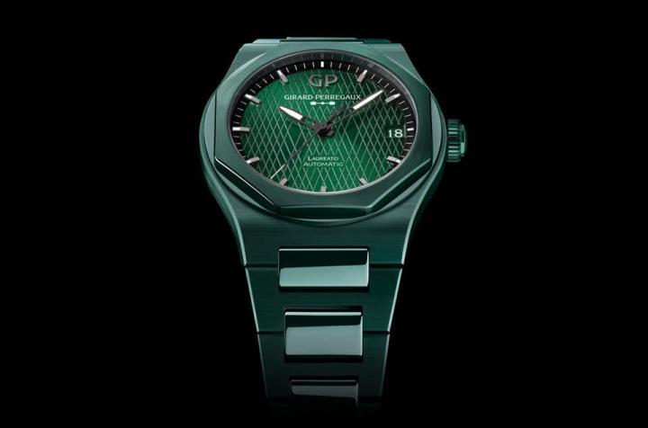 GP以氧化锆和金属氧化物调配出Laureato Green Ceramic ASTON MARTIN Edition的绿色陶瓷材质,一般而言陶瓷的硬度比不锈钢高约7倍,保护性很强但也代表着制作加工时相对困难,不过芝柏表制作陶瓷表壳的经验丰富,所以才会连英国赛车绿色都能调配得出。陶瓷的优点如高硬度、色泽常保如新、轻盈且亲肤性佳等,用来制作表壳炼带零件,不论佩戴感受或是视觉魅力都与金属材质有别。以陶瓷材质制作的Laureato Green Ceramic ASTON MARTIN Edition让人好感度高的原因除了罕见的颜色,其外观的繁复层次也是一个不可忽略的重点,仔细端详桂冠系列的表壳,会发现它的表圈为八角形,表壳又有点酒桶形的味道,同时表圈和中层表壳间又是圆形,这种复杂的几何形状组合,要用高硬度的陶瓷制作,光想就可以感受到手表的制作过程充满挑战性。
