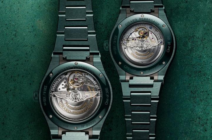 表款背面都配置透明底盖,其上都印有ASTON MARTIN的品牌标志揭示联名表的身份,底盖下方分别露出载GP03300机芯(38mm)和GP01800机芯(42mm),前者的动力储存为46小时、后者则是54小时,由于两枚机芯都是自动上炼,因此实用性较不令人担心。而在机芯外观方面,GP针对底板与自动盘施以日内瓦波纹、主夹板有鱼鳞纹,其他零件分别采用倒角、镜面抛光、缎面磨砂、蜗形纹和太阳纹处理,精工细作的质感完全展现高级表厂的身手,同时手表底盖右侧也都刻有彼此的限量数字,其中38mm款限量188只,42mm款则是限量388只,稀有性加上魅力独具的英国赛车全陶瓷壳,建构出手表令人怦然心动的强大魅力。