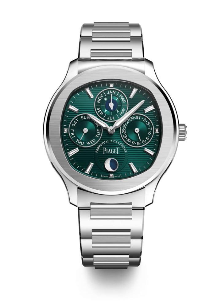 表款面盘颜色为近年表坛流行的绿色,其水平条纹设计为Polo系列自从1979年问世始终如一的重要特征之一,如今在功能更复杂的万年历手表上依旧维持这项特色,此外手表的夜光时标与指针也不因功能进阶而有所牺牲,如此追求细节的设计使其更适合日常佩戴,这也是近年高级运动表之所以深受收藏家青睐的关键因素。