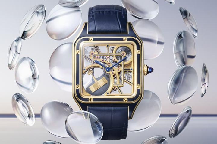 Santos系列2023年的话题作品为搭载9629 MC自动镂空机芯的款式,面盘上左下角的微型自动盘状似La Demoiselle小型飞机,这款经典飞机正是由Santos-Dumont于1907年设计,其采用黄金材质,并以海军蓝真漆加以点缀,同款还有玫瑰金与不锈钢款,但是有真漆点缀细节的仅有限量发行的黄金款。
