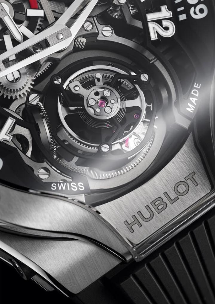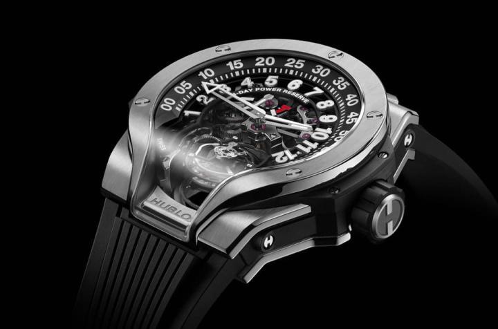 钛金属材质/HUB6200手动上炼机芯/逆跳时、逆跳分显示/双轴陀飞轮装置/动力储存显示/蓝宝石水晶镜面、透明底盖/防水30米/表径44mm/限量50只/参考价:¥ 1,105,500