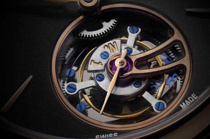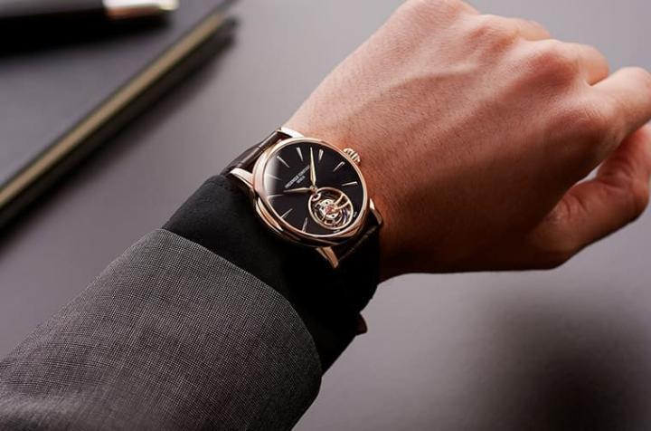 表款搭配棕色鳄鱼皮表带以及黑色面盘烘托玫瑰金材质的贵气,包括指针与时标等也同为玫瑰金色,黑色面盘以太阳放射纹处理可以反射出多变的光芒,而这次乍见手表的陀飞轮装置时,会让人感到手表似乎变俐落了,之所以会有一种惊喜感是因为过去搭载FC-980机芯的陀飞轮手表,其陀飞轮框架会固定在一枚延伸至面盘的桥板上,使得面盘右下角额外多出一块银色的机芯零件,其与陀飞轮的圆形框架刚好组成一个类似逗号的造型,看起来格外有特色。