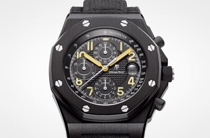 25770SN当年引人注目的黄色细节,如今在新款皇家橡树离岸型计时码表还是能找到似曾相识的印象,因为面盘外圈的测速仪刻度、时标与指针的夜光物料同为黄色,与表壳和面盘的黑色搭配共构出皇家橡树离岸型End of Days限量款计时码表当年令人津津乐道的亮眼造型。表款的时标与指针外观的黑色乃是镀镍处理后的成果,实际上它们皆为白金材质,低调的贵气与ROO讲究运动感的本质不谋而合。