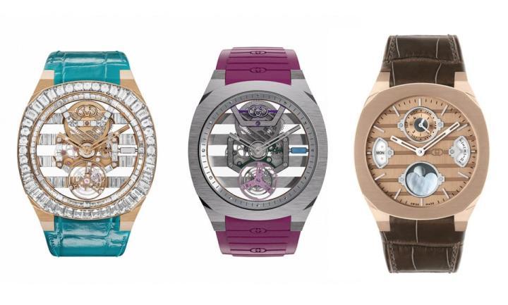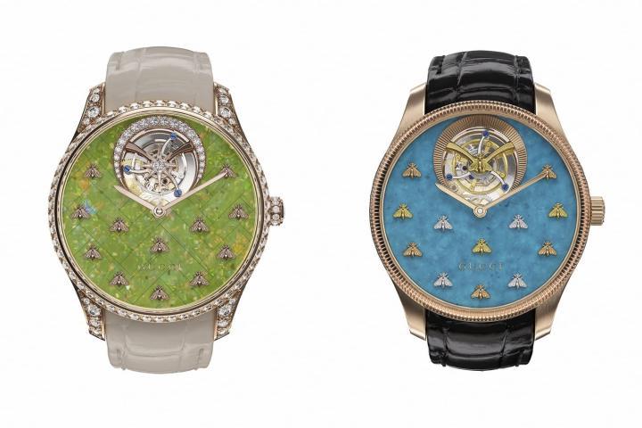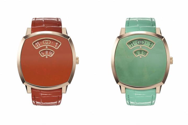 此系列主打表坛于1920年代创制的跳时结构,这种结构的诞生主要是为了强调走时精准度:手表显示系统会在第60分钟为“瞬跳”至下一个小时提供动力。2023年GUCCI分别推出两款玫瑰金新作,一款搭配砖红色碧玉面盘,一款则启用绿玉髓面盘,两款分别配置与面盘色调相近的鳄鱼皮表带,抢眼外观结合俐落跳时机制,让人感受到品牌前卫大胆的造型创意与扎实的工艺水准。