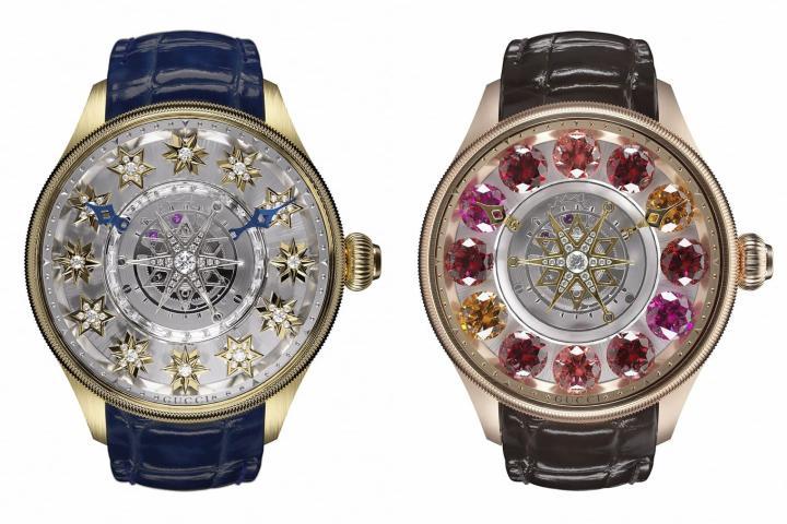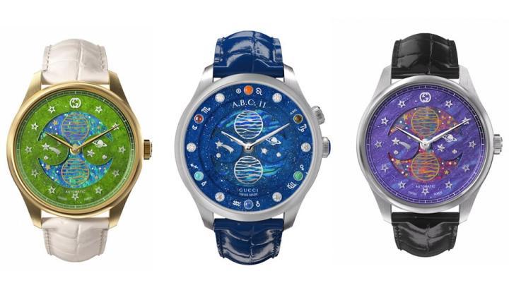 GUCCI以猎户座大星云NGC 1976命名手表搭载的陀飞轮机芯GGC.1976.DS,顾名思义这款采用中置陀飞轮设计的作品不仅在星形陀飞轮框架镶上璀璨美钻,更在面盘上镶上12颗宝石代表时标,甚至当佩戴者按下与表冠同轴的按把时,这些宝石时标还可以进行自转(宝石将自转9秒,并在90秒内绕着面盘顺时针旋转),让人看得眼花撩乱。GUCCI此次共推出四款G-Timeless Planetarium系列新作,其中有两款以月球为主题,一款面盘镶嵌12颗埃塞俄比亚蛋白石,在半透明蓝色背景的衬托下格外耀眼;另一款则由拓帕石、橄榄石、紫水晶和埃塞俄比亚蛋白石组成如梦似幻色彩。系列中还有一款面盘镶有红宝石、火蛋白石、粉红色碧玺及橙黄色石榴石等,诠释无限美好的红色日落景色;最后一款主题转化为星辰,面盘上可见以金工制作的四种星星造型时标,每枚时标都会镶上钻石,与面盘中央的星形陀飞轮相互辉映,散发熠熠星光。