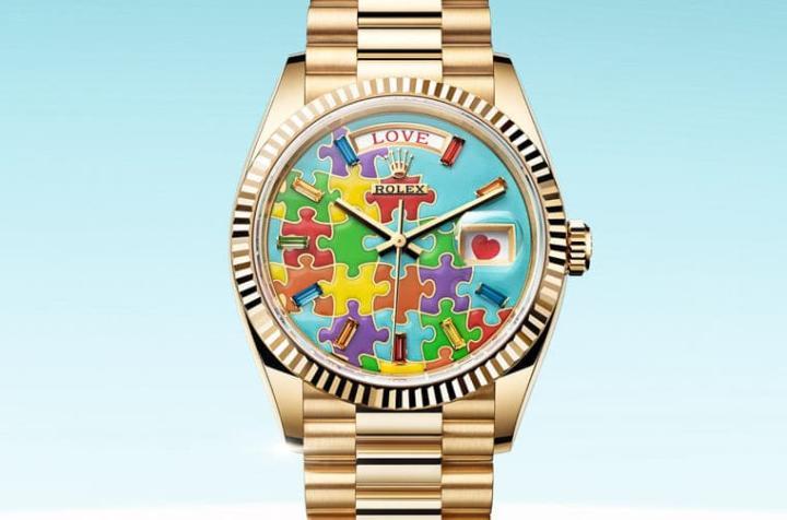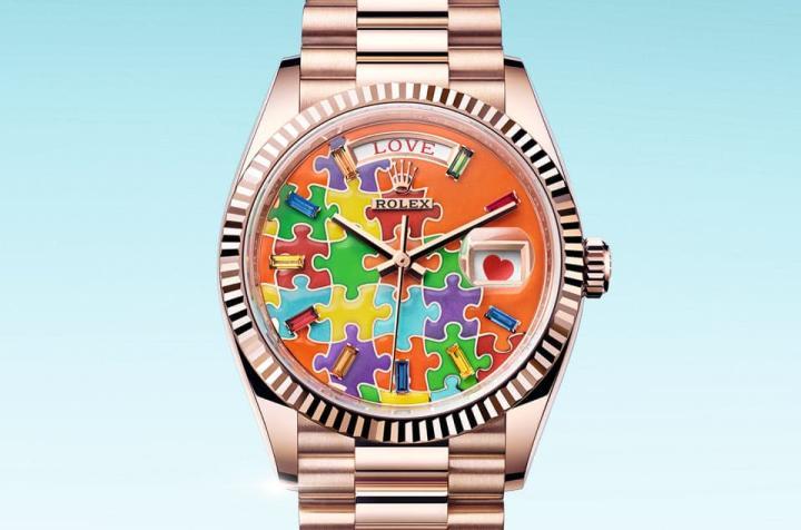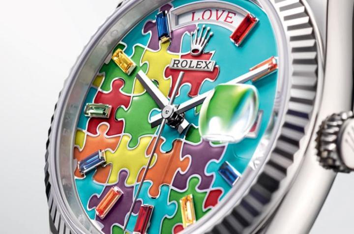 新款Day-Date 36的面盘分别以绿松石(黄金款与白金款)和橘色(永恒玫瑰金款)为底,劳力士加码镶嵌10颗矩形切割彩色蓝宝石,分别有绿色、红色、蓝色、黄色与橘色等不同颜色。品牌更从拼图获得灵感,以内填珐瑯工艺勾勒出尚未完全拼合完整的拼图样貌,每枚“拼图”分别填上绿松石蓝色、红色、紫红色、橙色、绿色及黄色的珐瑯釉料,缤纷抢眼的效果丝毫不逊于OP的彩色气泡,甚至质感和细致度还要更高。