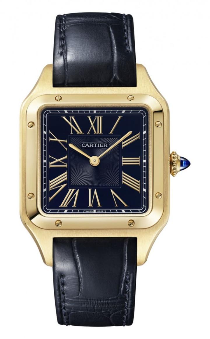 Santos-Dumont系列另外推出两款搭载石英机芯的大型款,一款为不锈钢表壳搭配黄金表圈,另一款则是黄金表圈,前者配置的是灰色缎面放射状太阳纹面盘、后者则是搭配海军蓝色缎面放射状太阳纹面盘,包括表带也都与面盘同色调,至于面盘上的罗马数字时标以及指针都是金色系,展现与Santos阳光豪迈风格有别的隽永雅致风格。