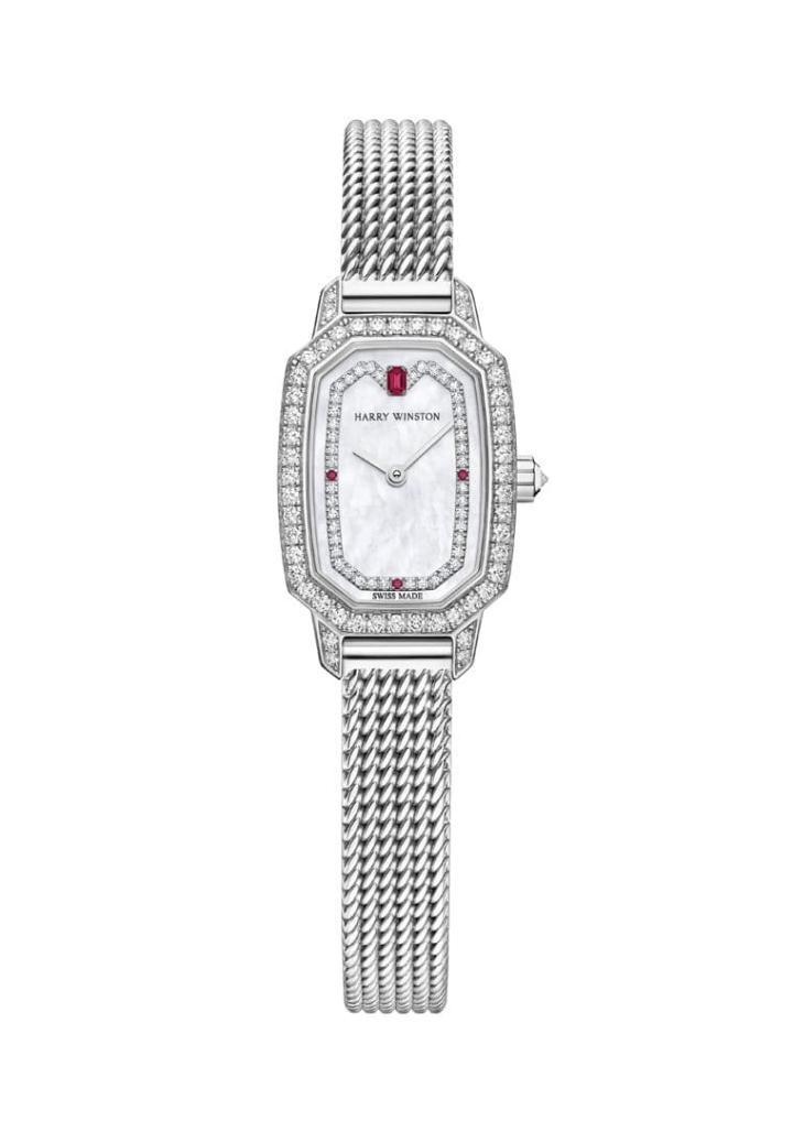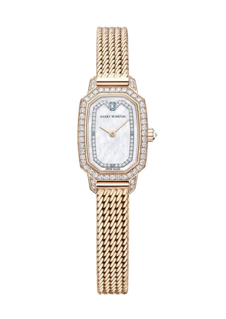 不论小型或大型的印记Emerald腕表,有的款式采用太阳放射纹,有的则用珍珠母贝面盘,甚至有的款式是镶嵌蛋面切工妆点,各种颜色与材质本身的特性,造就出腕表各异其趣的美感,搭配不同的表带互相组合之下,系列的选择性因而显得多采多姿。每款印记Emerald腕表会镶有一枚18K金品牌标识或一颗祖母绿型切工宝石,而海瑞温斯顿为了向Harry Winston先生钟爱的宝石切工致敬,特地在在八边形表壳中央或者雕琢的斜面细节上,镶有一颗颗圆形明亮式切工的钻石,使腕表发出明耀晶亮的光芒。
