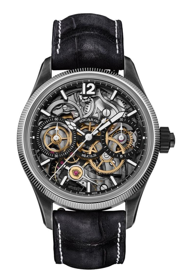1858系列Unveiled Secret单按把计时码表搭载的MB M16.26手上炼机芯,震频为18,000A/h,动力储存达50小时。