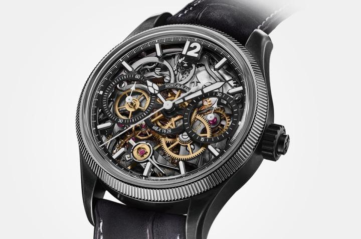 新款采用仿旧钢材质,大致而言是将手表的不锈钢表壳施以黑色涂层,再经过手工水洗,呈现石灰石刷纹处理效果。表款配置白金凹槽纹表圈,设计与Minerva表厂于1927年所推出的第一款凹槽纹表圈作品相似,同时品牌还替手表搭配黑色磨砂鳄鱼皮表带和仿旧钢三折式表扣,呈现整体呼应的洗练外观造型。