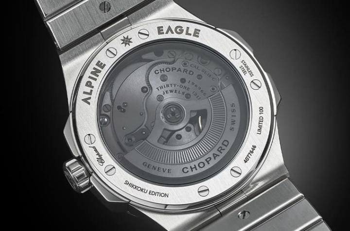 Shikkoku这种黑色来自日本的漆器工艺Urushi,因此你可能会以为品牌会用漆艺来制作这款Alpine Eagle的面盘,但其实不然,萧邦是用黑色来诠释这种漆器代表性的黑色,因此手表面盘不是用漆艺上色,但是它的深黑色调还是能让人和日本禅宗那种神祕、简单与宁静的美学理念连结在一起,展现与日本文化的设计渊源。