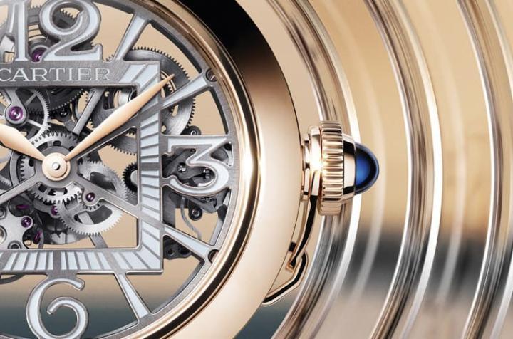 面盘可见卡地亚镂空手表招牌元素:将镂空桥板与时标进行完美的结合,尤其3、6、9、12点方向的时标改成阿拉伯数字更是精妙,甚至时标与刻度都还涂上夜光物料,呈现一般镂空表不太强调的夜视效果。面盘中间同样保有Pasha系列不可少的矩形轨道式刻度,其与表壳呈现出一种圆中带方的对比感;此次手表启用玫瑰金指针,不过其表面未加上夜光物料,还好时标和刻度的夜光物料可以弥补,不致影响手表在暗处的阅读效果。