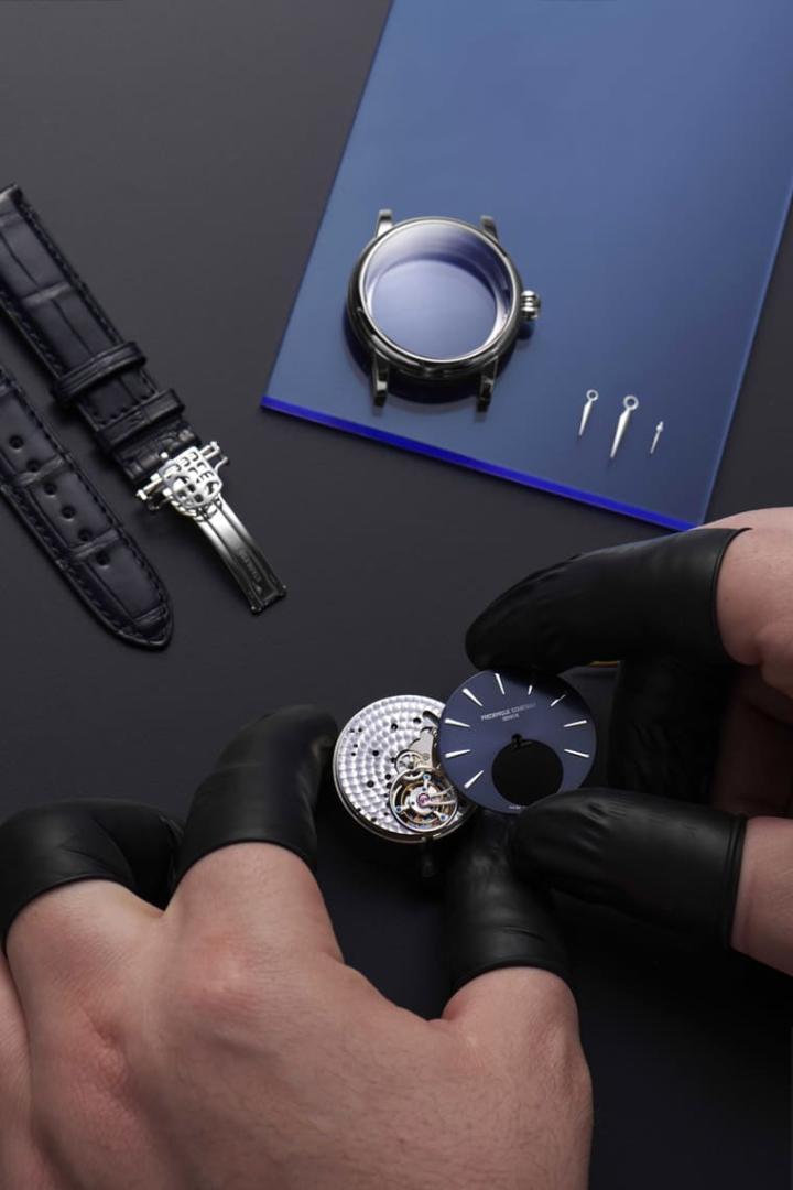 康斯登自制陀飞轮第一款采用太阳纹午夜蓝色面盘,搭配全抛光表壳,点缀雾面蓝色鳄鱼皮表带。 第二款稍有不同,虽然采用相同颜色与材质的表带,但搭配太阳纹银色面盘。每件作品都会在陀飞轮外壳上及背面单独镌刻编号,佩戴者在表背能够欣赏到FC-980自制机芯的装饰工艺(如倒角、环形纹理、侧翼拉丝及镜面抛光),呈现瑞士高级制表引人入胜的传统。