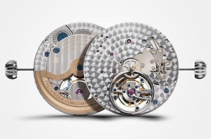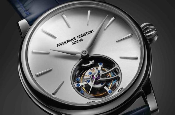 在面盘方面,格局显得简约而现代,锥形时标采用手工镶嵌,与面盘齐平,指针的加工处理一如时标,这一技术保证零件可以散发亮眼光彩。面盘12点方向位置”Frederique Constant - Genève”字样强调品牌出身自日内瓦的工艺血统,6点方向的视窗则展示了这款手表最主要的复杂功能:陀飞轮。透过混合擒纵机构的多个位置来补偿重力对机芯的影响,从而建立理想的走时速率平均,陀飞轮上还掠过一枚小秒针,其具备停秒功能,能辅助佩戴者调校最正确的时间。