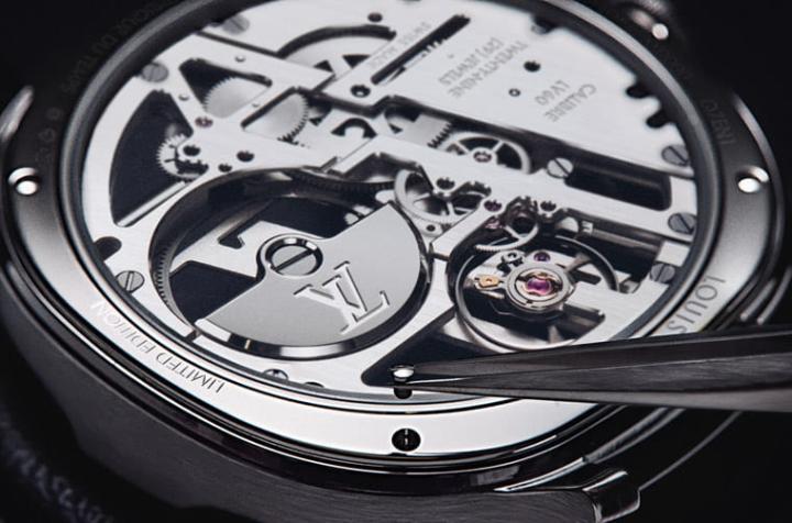 LV60机芯表桥可以看到构成LV字样的几何线条,有LOUIS VUITTON字样的镂空发条盒大卷车,以及装饰经典 Monogram图案当中的LV交叠图案的自动盘。LV字样形状的表桥需要加上比传统全表桥更多的装饰。如此重视细节的态度,确保腕表表面与机芯镀铑零件所创造出近乎单色的美感,能够完美保持一致。