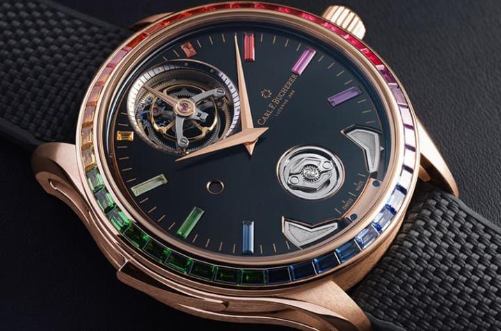 18K玫瑰金材质/CFB MR3000自动上炼机芯/时、分、小秒显示/三问功能/陀飞轮装置/表圈镶沙弗莱石、蓝宝石、红宝石共40颗,约重4.3克拉/面盘镶沙弗莱石、蓝宝石共8颗,约重0.3克拉/蓝宝石水晶镜面、透明底盖/防水10米/表径43.8mm/限量1只
