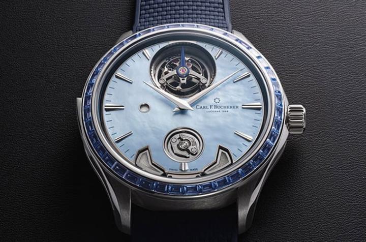 18K白金材质/CFB MR3000自动上炼机芯/时、分、小秒显示/三问功能/陀飞轮装置/表圈镶方形切割冰蓝色蓝宝石40颗,约重4.3克拉/冰蓝色珍珠母贝面盘/蓝宝石水晶镜面、透明底盖/防水10米/表径43.8mm/限量1只