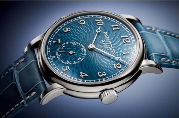 相较于5178G-001的朴素米色珐瑯面盘,5178G-012先以手工机刻赋予面盘漩涡纹路,然后品牌还会在面盘涂覆半透明蓝色珐瑯——这其实是传统的透明珐瑯工艺,也就是利用雕刻与半透明珐瑯的合作,呈现出富有层次感与美感的效果。手表面盘周围还是镶嵌上白金立体宝玑数字时标,搭配白金宝玑指针,在蓝色面盘上清楚显示,至于面盘最外围和6点方向皆以转印方式印上白色的轨道式刻度与小秒盘刻度,辅助佩戴者清楚读时。