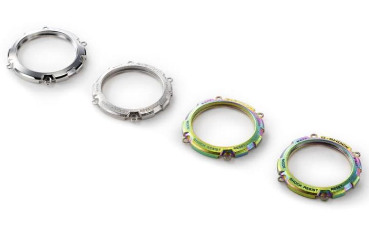 G-SHOCK为了揣摩极光般的七彩炫光,因此将不锈钢零件先采再结晶技术与深层硬化处理,接着又用彩虹离子IP镀膜,呈现出最终我们眼前看到的缤纷色调金属表壳。包括底盖也运用相同的工艺制作,不过G-SHOCK在特定范围进行重新抛光恢复原本的金属色泽,因此底盖会呈现凹凸起伏层次,其中突起的地方是银灰色的金属光泽,至于凹陷的部分则是与表壳相同的用彩虹离子IP镀膜效果,使得手表背面更显变幻莫测。